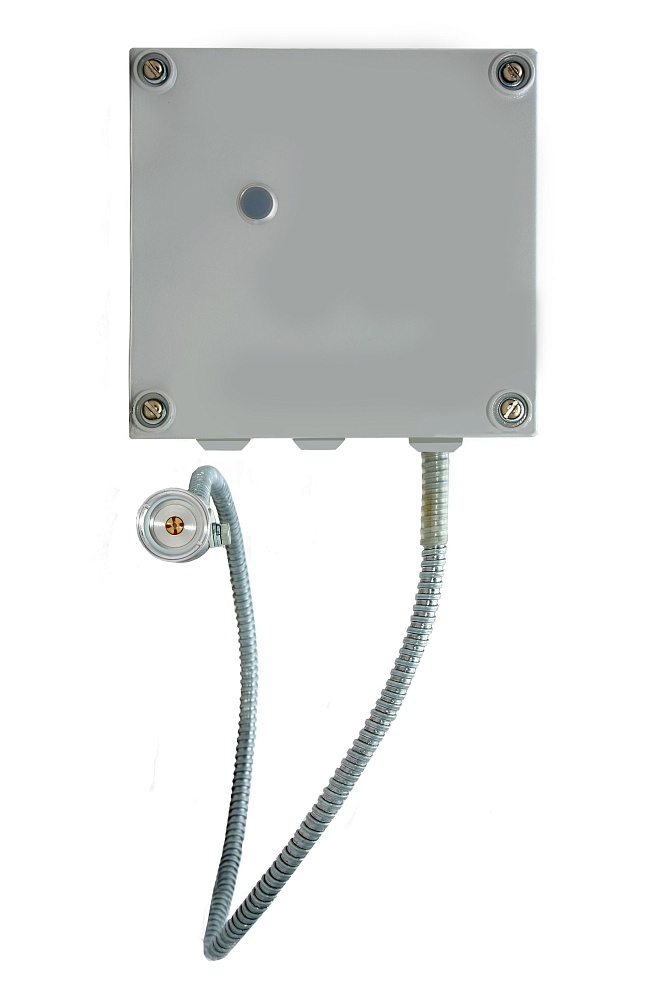 ИК извещатель пламени с ЧЭ на оптическом кабеле в металлорукаве (1...25м), 2-х проводный, с фильтрацией периодических помех. Дальность обнаружения до 30м (ТП-5), угол обзора 90°, U-шс.9...28В, I-потр.350мкА, IP55 (66), t-раб.-10...+55°, 200х200х70мм