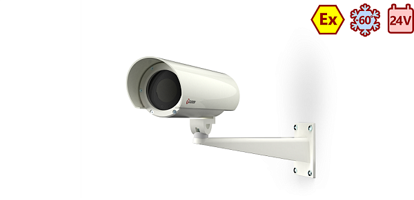 Термокожух взрывозащищенный для видеокамеры; класс взрывозащиты 1Ex db IIC T6 Gb X / Ex tb IIIC T80°C Db X)DC 24В/24 Вт, встроенный блок питания DC 12В/350 мА; полезный объем 50х50х131 мм; IP66/IP68; -60°С…+50°C; гермоввод под не бронированный кабель диаметром 3,2-8,1мм с фиксатором металлорукава. В комплекте настенный кронштейн и солнцезащитный козырек