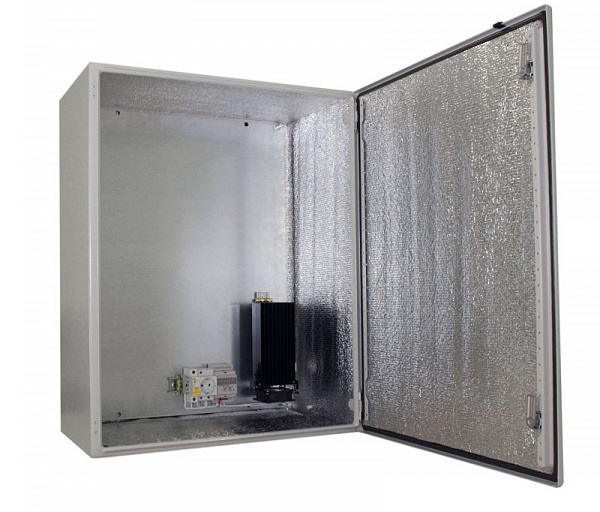 Шкаф климатической защиты с монтажной панелью взрывозащищенный 2ExemIIТ4 Х; U-пит.220 В, P-потр.100 Вт; IP66, t-раб.-75...+60°С, 300х400х150 мм. Сварной корпус с полимерным порошковым покрытием. В комплекте: шкаф, конвекционный подогреватель, терморегулятор (биметаллическая пластина), съемная панель кабельных вводов. Без кабельных вводов (количество и тип оговаривается при заказе).